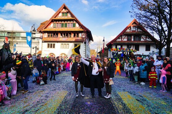 Sonnenschein am Nachmittag am Umzug in Baar. Tausende von Menschen säumen die Strasse im Dorf auf unserem Umzugsweg. Es ist toll so durchs Dorf zu laufen.Nach dem Umzug gibts beim Marktgassschulhaus eine wohlverdiente Verpflegung, Würstli mit Brot und ein Getränk. Danach verziehen wir uns auf die Burgmatt zu Daniela und René, dort können wir uns aufwärmen bei Kaffee oder Tee.